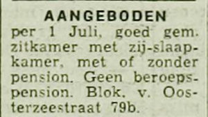 Blok, kamers, Advertentie. “Rotterdamsch nieuwsblad”. Rotterdam, 25-06-1940, p. 3. Geraadpleegd op Delpher op 29-03-2022, https://resolver.kb.nl/resolve?urn=ddd:011002422:mpeg21:p003.